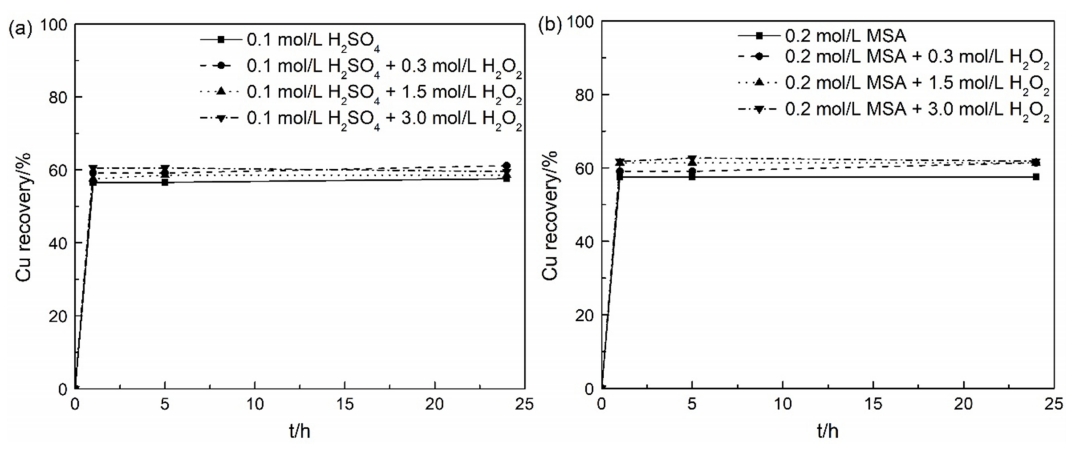 in five hours. Around 57% and 63% copper were extracted in 0.1 mol/L sulfuric acid