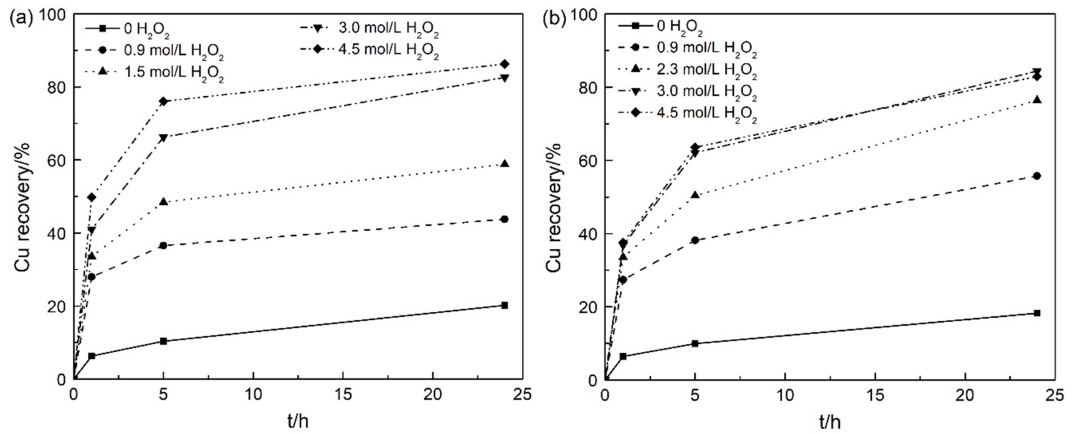 In leaching systems where H2O2 used as oxidant, as shown in Figure 5, a significant growth in the copper recovery was observed with increased H2O2 concentration. When H2O2 concentration exceeds 3.0 mol/L, over 80% extraction was achieved. This is due to