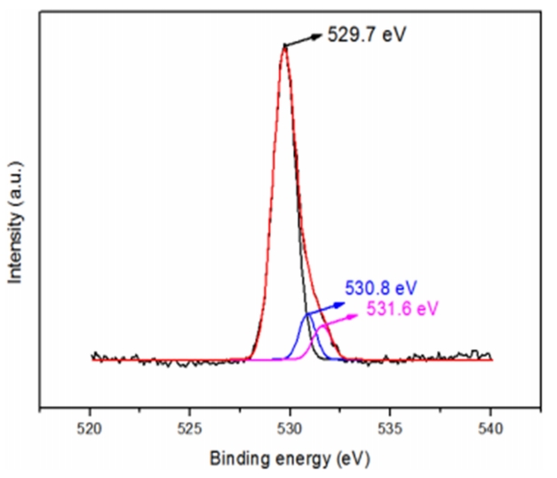 연관된 O2- 이온 (VAC)에 의하여 나타나는 것이고, 마지막으로 가장 높은 결합피크는 531.6 eV 부근에 나타나며, 이는 표면에 수분이나 산소등의 결합으로