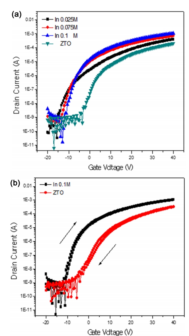 그림 6b은 EHD jet spray 공정으로 제작된 ZTO TFT와 InZTO TFT에서의 hysteresis 특성을 비교한 것이다. 게이트 전압을 양의