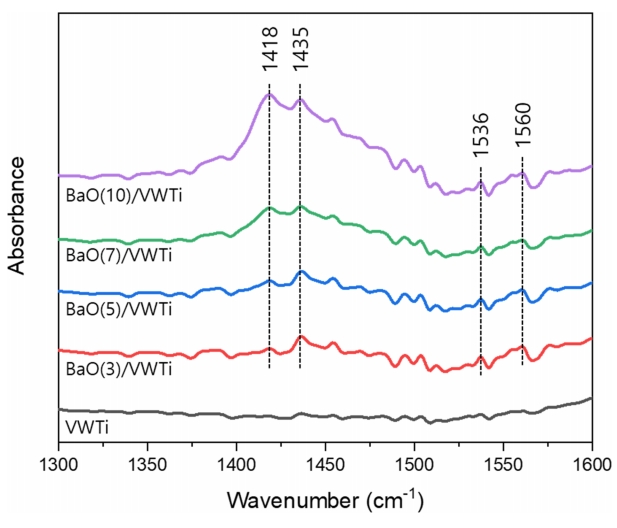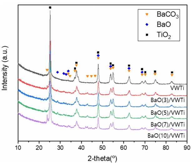 BaO 0~10 wt%, V2O5 1 wt%, WO3 8 wt% ๋ฐ TiO2 ์ง์ง์ฒด๋ฅผ ํตํด ๋ด์ง๋ ์ด๋งค๋ BaO(0~10)/VWTi๋ก ๋ช