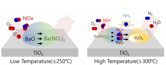 ๋ณธ ์ฐ๊ตฌ์์๋ ๋ํ์ ์ธ Vanadium๊ณ SCR ์ด๋งค์ธ V2O5-WO3/TiO2 ์ด๋งค์ BaO๋ฅผ NOx ํก์ฐฉ์ ๋ก ์ฌ์ฉํ์๋ค. ํฉ์ฑ๋ ์ด๋งค ๋ด์์ BaO๋ NOx ํก์ฐฉ ๋ฌผ์ง๋ก์จ, 200 โ ์ดํ์์ ์ง์ฐ์ผ์ ํํ๋ก NOx๋ฅผ ํก์ฐฉํ์ฌ,