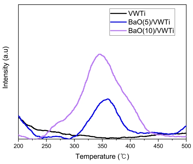 Adsorption behaviors of the BaO loaded V2O5-WO3/TiO2 Catalyst at gas condition with [NO]=500 ppm, [O2]=5 vol%, [N2]=balance and GHSV=30,000 h-1