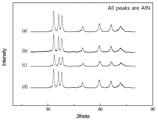 시간이 작아서 AlN 결정립 성장이 어렵기 때문으로 판단된다. 또한, 고 에너지 볼 밀링한 AlN 나노분말을 초기 분말로 사용했기 때문으로 생각된다.
