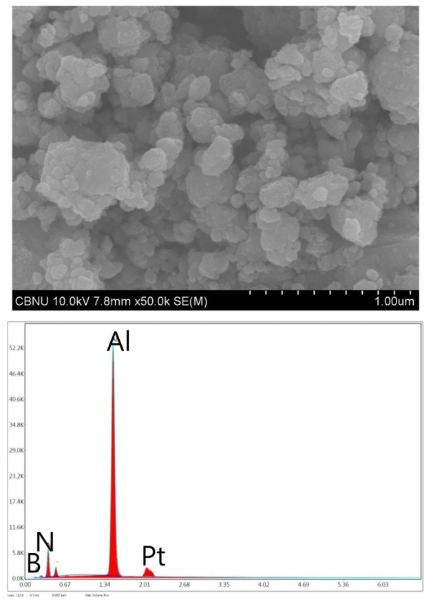 Al, N, B과 Pt 피크만 관찰되었고, 볼이나 용기로부터 오염될 수 있는 텅스텐 이나 철 피크는 관찰되지 않았다. Pt피크는 분말의 미세조직을