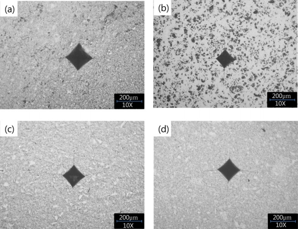 하중으로 결정하였고, 파괴인성은 압흔자국 모서리에서 발생된 균열의 길이를 측정하여 Niihara 식 [17]으로 결정하였다.