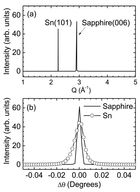 sharp; the FWHM of the sapphire(001) peak is 0.0037°, and that of the Sn(101) peak