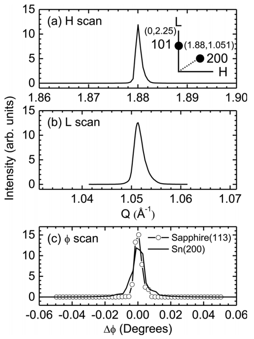 Sn(200) Bragg peak, as shown in Fig 4(c). A ϕ scan of the sapphire(113) peak is also shown for comparison. The FWHM of the