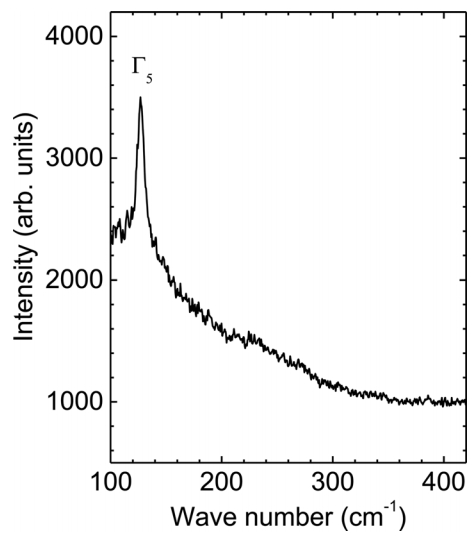 frequencies of the optical Γ-point phonons: the Γ3 phonon mode in the longitudinal direction at 45 cm-1 and the Γ5 photon mode in the transverse direction at 130 cm-1 [27,28]. Raman spectroscopy shows a dominant peak at 127.15 cm-1, which can be indexed as the Γ5 phonon mode, because it matches the theoretical value well. The strong Raman spectrum