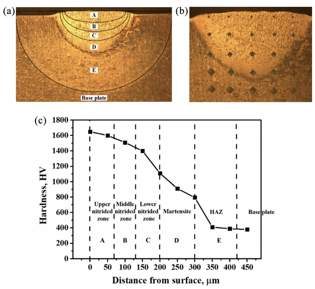 1450 HV, C는 하부 질화영역으로 평균경도 950 HV, D는 마르텐사이트영역으로 평균경도 740 HV, E는 열영향부로 평균경도 410 HV로