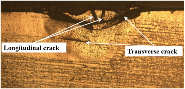 레이저 질화처리시 10%, 40% 질소농도에서는 균열이 발생하지 않았으나, 그림 16에 보인 바와 같이 70% 질소가스 분위기에서는 폭의 가로 및 세로방향으로 균열이 발생하였다. 전술한 바와 같이, 레이저 질화 반응이 수행되는 동안