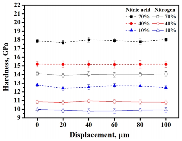 시편 단면의 질화 영역을 100 mN의 하중을 적용하여 20 μm의 수평 압입 간격에 따라 경도를 측정한 결과를 그림 18에 나타내었으며, 질산 및 질소의 농도가 증가할수록 하중에 대한 저항이 증가함을 보여준다. 질산 용액과 혼합질소 가스의 비율이 각각 70%일 때,