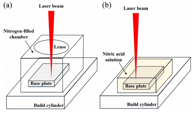 하는 방법이다. 그림 2 (b)는 질산을 이용한 질화처리 방법이며, 시편을 질산 용액이 채워진 실린더 내부에 침지 시킨 후 레이저 빔을 조사하여 질화처리를 하는 방법이다. 질산