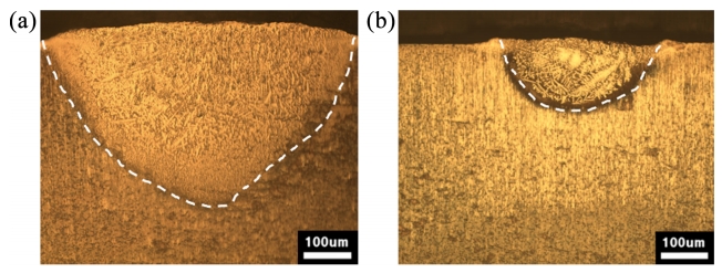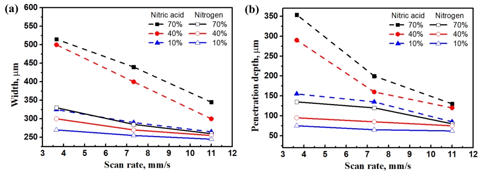 레이저 주사 속도가 감소함에 따라 침투 깊이와 질화 영역의 폭이 증가하는 것은 에너지 밀도가 증가하여 에너지 흡수가 높아지기 때문이다. 레이저 입열량을