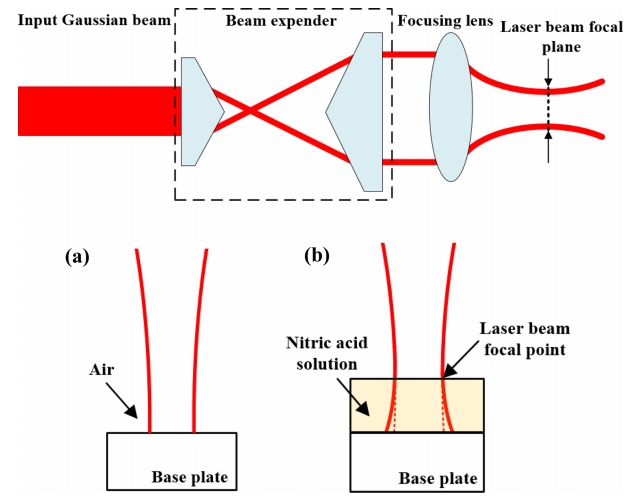 굴절 정도는 매질의 밀도에 의존적이며, 빔의 굴절 정도에 따라 빔의 직경이 변하여 용융 영역의 폭과 침투 깊이가 달라진다. 그림 7 (b)는 질산 용액 속에서의 빔 굴절율을 나타낸 도식도이며, 물보다 밀도가 높은 질산 용액에서는 입사각보다 굴절각이 감소하여 굴절율 증가로 인해 조사되는