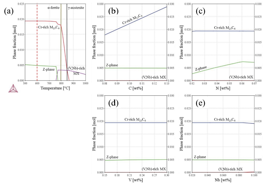 ์๋ค [6]. Nb๋ ~0.085 wt% ์ด์์์ (V, Nb)-rich MX ์์ถ๋ฌผ์ ์ฝ๊ฐ ์ฆ๊ฐํ๊ณ Cr-rich M23C6 ์์ถ๋ฌผ์ ์ฝ๊ฐ ๊ฐ์ํ๋ค [18]. ๊ทธ๋ฌ๋ C์ N ํจ๋์ ๋นํด์ V์ Nb ์์๋ค์ ์์ถ๋ฌผ ์๋ถ์จ์ ๋ํ ์ํฅ์ด ํฌ๊ฒ ๋ํ๋์ง๋ ์์๋ค.