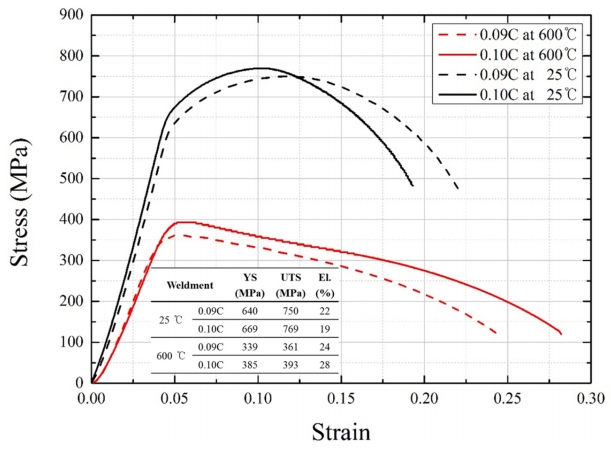 Stress-strain curves of 9C-1Mo weld metal at 25 oC and 600 oC.