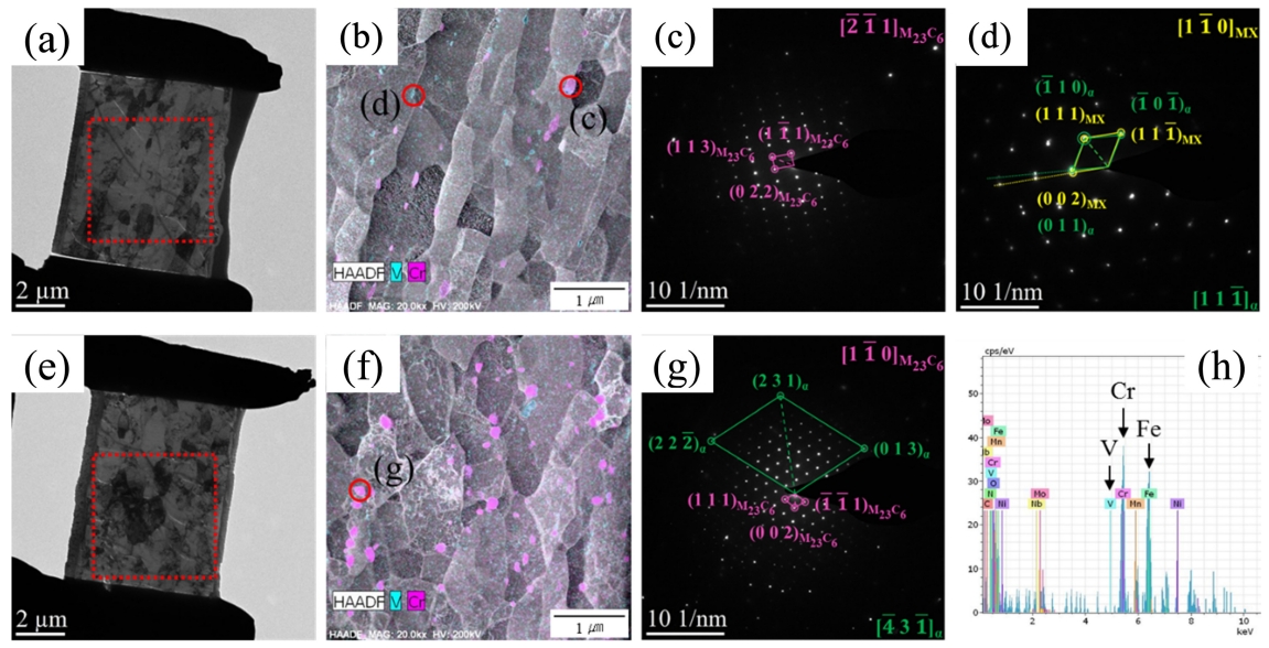 (f) of 0.10C, and (h) Cr-rich M23C6 spectrum.