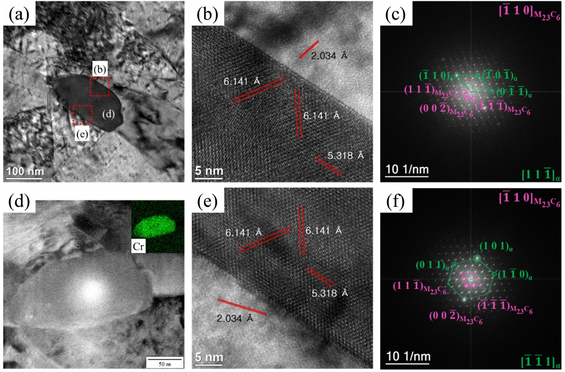Cr-rich M23C6 precipitate, (e) HR-TEM image of interfaces between Cr-rich M23C6 and matrix, and (f) FFT images of (e).