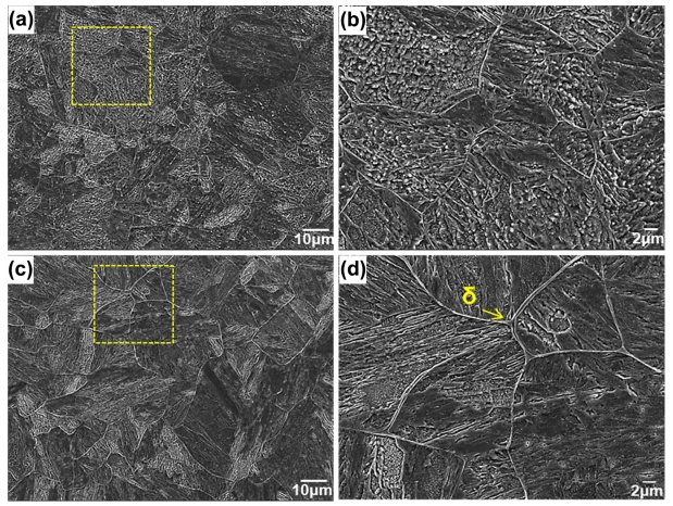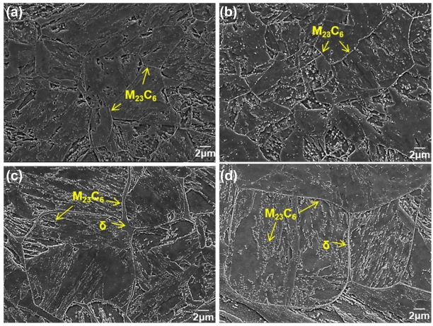 SEM micrographs: (a) HAZ 2 heat-treated at 688 oC, (b) HAZ 2 heat-treated at 788 oC, (c) HAZ 1 heat-treated at 688 oC, and (d) HAZ 1 heat-treated at 788 oC