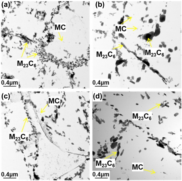 그림 11은 TEM을 이용한 석출물 분석 결과를 나타낸 것이다. 모재와 동일하게, 결정립계를 따라 생성된 조대한 Cr-rich M23C6-type 탄화물과 결정립 내부에 분포하는 미세한 Nb/C-rich MC-type 탄화물이 주된 석출상임을 확인하였다. 한편 두 시편에서 MC-type