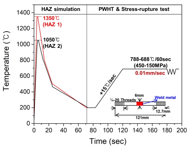 용접 HAZ 재현 후 PWHT 온도인 688-788 oC까지 가열한 후 PWHT 균열 감수성 평가를 위한 stress-rupture test를 실시하였다. PWHT 온도 범위는 Ni기 초내열합금과의 이종용접을
