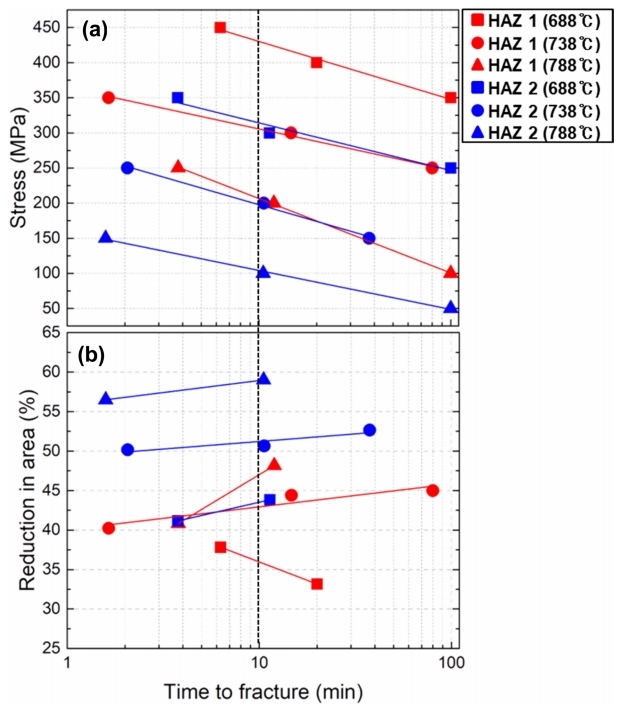 그림 9는 재현 HAZ에 대한 stress rupture test 결과이다. HAZ 1과 HAZ 2 모두 PWHT 온도가 낮아질수록 파단강도는 증가하지만