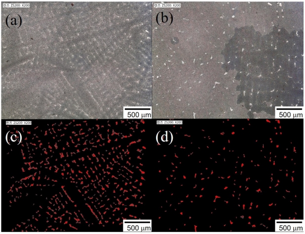그림 3은 열처리 전·후 미세조직 변이 관찰을 위하여 레이져 현미경을 이용하여 측정한 metal+carbide상(이하 MC carbide로 명명)이다. 그림 3 (a) 및 (c)는 열처리 전, 그림 3의 (b) 및 (d)는 열처리 후의 MC carbide 측정 사진이다. 열처리 공정을 수행한 Ni기 합금의 경우 미세조직 내에 MC carbide가