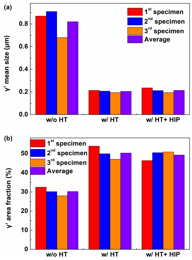 HIP 공정은 조직 내의 미세기공 제거를 통하여 무결성 향상 및 산포를 감소시키지만, γ'의 평균 크기 및 분율은 변화가 미비한 것을 관찰 가능하였다.