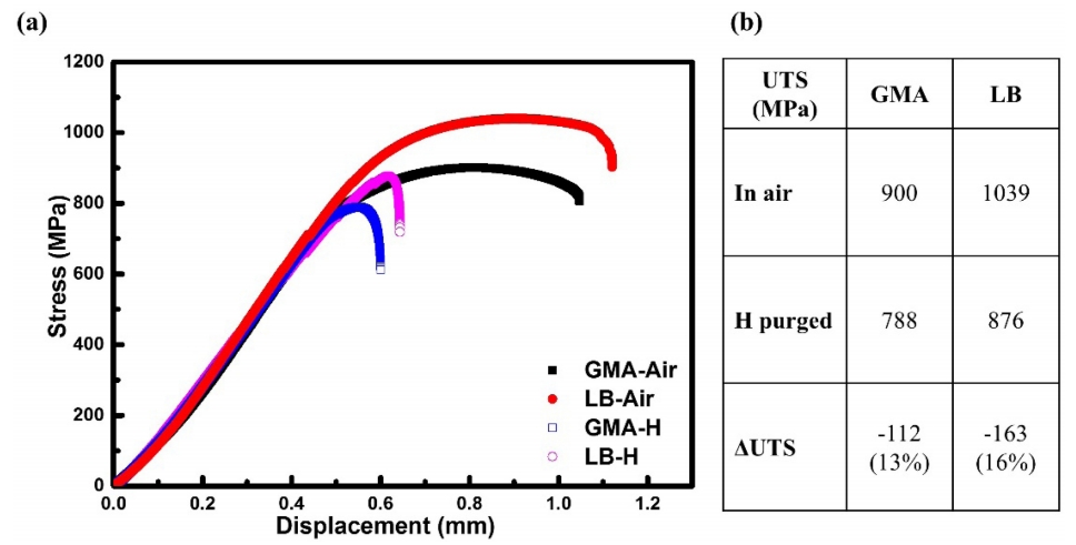 HIC behavior for API X65 steel welds: (a) stress-displacement curve and (b) UTS obtained