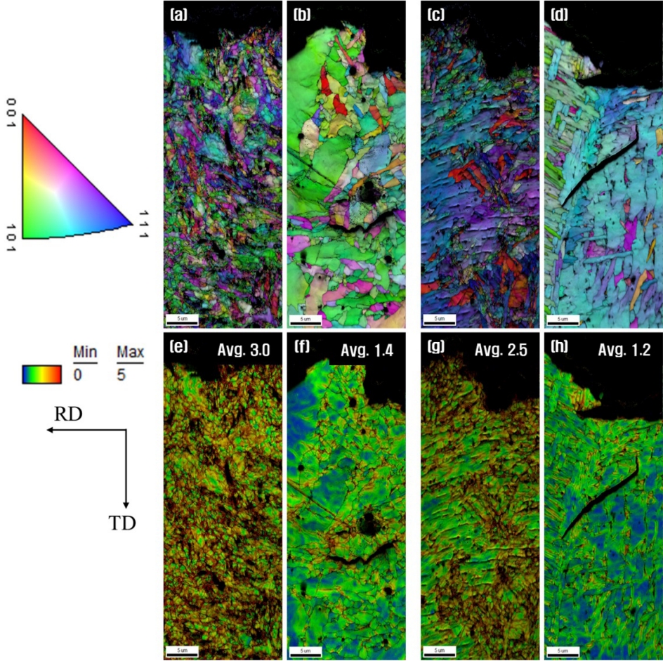 Inverse pole figure and KAM maps with average values after SSRT: (a), (e) in air;
