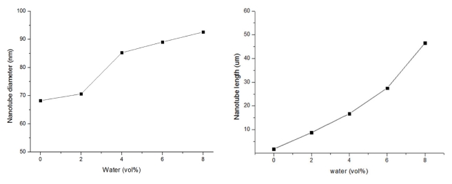 살펴보면 직경은 68.26 nm 길이는 약 1.78 μm였다, 물의 함량이 2 vol%일 때 양극산화 처리한 그림 3 (b)는 직경은 70.65 nm 길이는 약 8.769 μm였다. 물의 함량이 4%일 때 양극산화 처리한 그림 3 (c)는 직경은 85.27 nm, 길이는 약 16.73 μm, 물의 함량이 6%일 때 양극산화 처리한 그림 3 (d)는 직경은 89.04 nm, 길이는 약 27.5 μm였다. 물의 함량이 8%일 때 양극산화 처리한 그림 3 (e)는 직경은 92.61 nm, 길이는 약 46.5 μm였다. 이러한 결과를 물의 함량에 따른 나노튜브 직경과 길이의 변화로 도표화하여 분석한 결과를