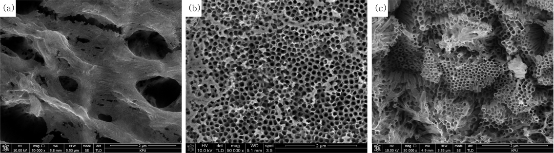 mA/cm2부터 30 mA/cm2까지 변화시키며 나노튜브 형상을 관찰하였다. 그림 6(a)는 나노튜브가 형성되지 않았으며 반면 그림 6(b)에서는 나노튜브가 형성되었으며, 그림 6(c)에서는 나노튜브가 형성되었지만 부분적으로 붕괴된 것을 볼 수 있다. 이러한 결과는 산화 피막층의 화학적 용해속도가 물로부터 공급되어지는 H+ 이온으로 인해 강하게 영향 받는데 [16], 이 이온의 공급은 전류밀도에 따라 달라지기 때문에 일정 전류밀도 이하에서는 이온들의 공급이 원활하게 이루어지지 않아 나노튜브가 형성되지 않았으며,