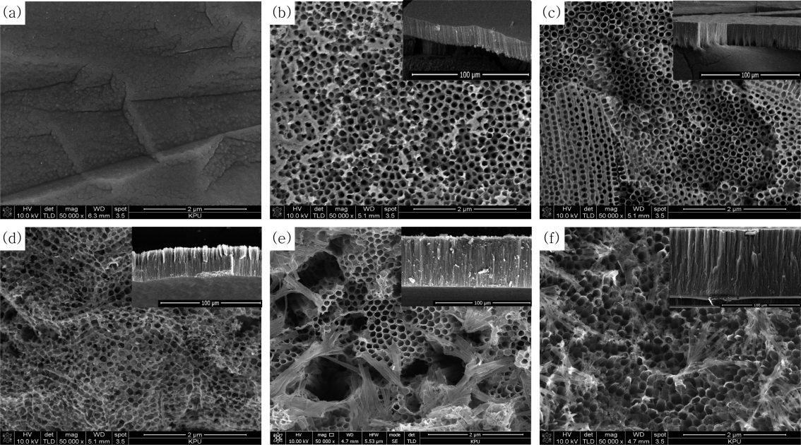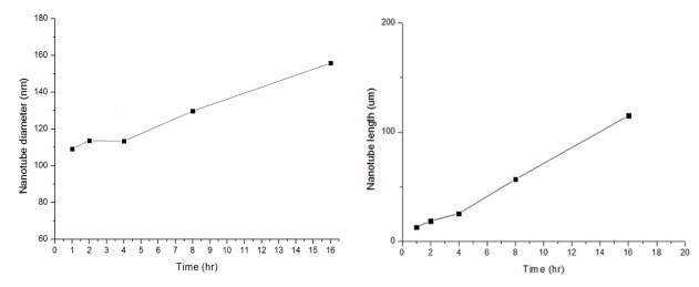 그림 8은 ethylene glycol + 0.2 wt% NH4F + 2 vol% H2O의 전해액에서 60 V의 전압과 최대전류밀도를 30 mA/cm2로 제한한 뒤 시간에 따라 변화하는 나노튜브의 형상을 관찰한 나노튜브의 표면과 단면사진이다. 30분 동안 양극산화 처리한 그림 8(a)를 살펴보면 나노튜브가 형성되지 않은 것으로 보여지며, 1시간 동안 양극산화 처리한 그림 8(b)는 직경은 109.1 nm 길이는 약 13.2 μm였다. 2시간 동안 양극산화 처리한 그림 8(c)는 직경은 113.7 nm, 길이는 약 18.89 μm, 4시간 동안 양극산화 처리한 그림 8(d)는 직경은 113.4 nm, 길이는 약 25.6 μm였다. 유지시간이 보다 길어져 8시간 동안 양극산화 처리한 그림 8(e)는 직경은 129.7 nm, 길이는 약 56.9 μm, 16시간 동안 양극산화 처리한 그림 8(f)는 직경은 155.8 nm, 길이는 약 114.9 μm였다. 이상의 결과를 시간에 따른 나노튜브의 직경, 길이 변화로 도표화하여 그림 9에 나타내었다. 초기 30분동안은 나노튜브가 형성되지 않았으며, 1시간 이후부터 나노튜브의 형상이 나타났다. 하지만 양극산화시간이 8시간이상이 되면