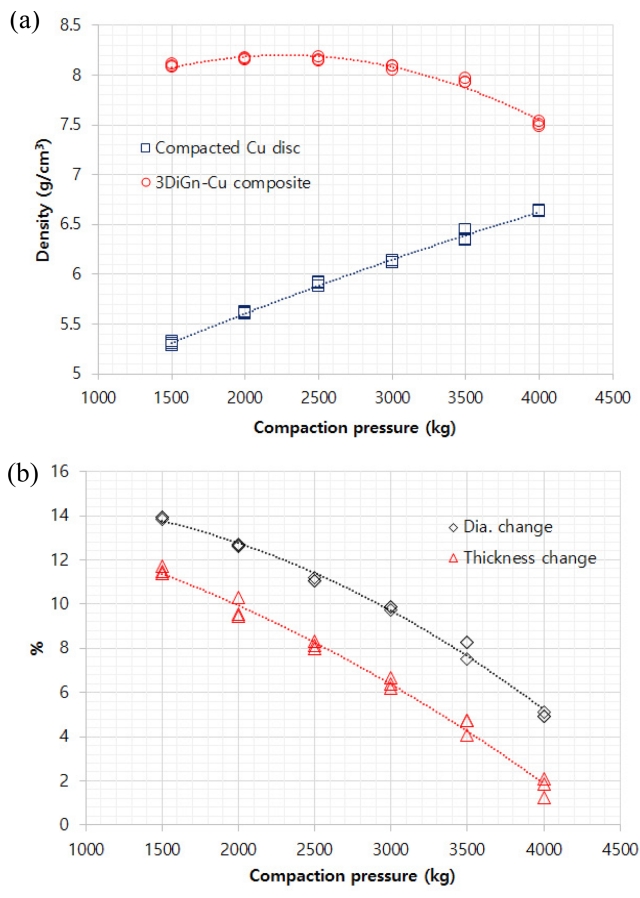 (compacted Cu discs) and after (3DiGn-Cu composites) CVD depending on the compacting