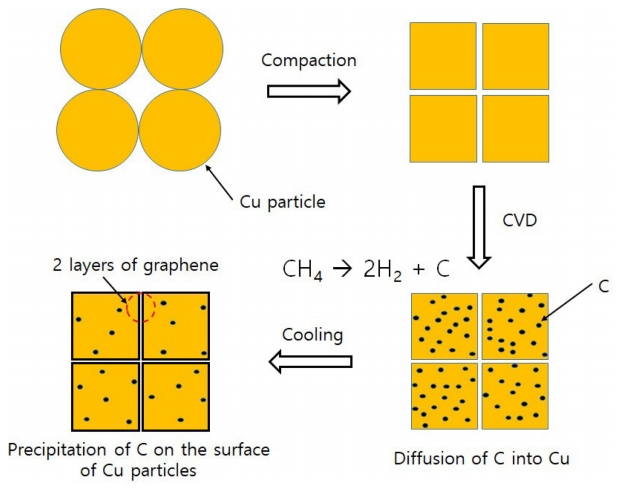 Figure 5 shows a schematic diagram of the synthesis of the 3DiGn-Cu composite [25]. At the initial stage of CVD, carbon diffuses relatively easily through the boundaries