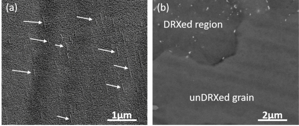 상대적으로 작은 영역에서 석출상들이 크고 선명하지만 결정립의 크기가 상대적으로 큰 영역의 석출상들은 작고 희미하다. DRXed region에서 결정립의