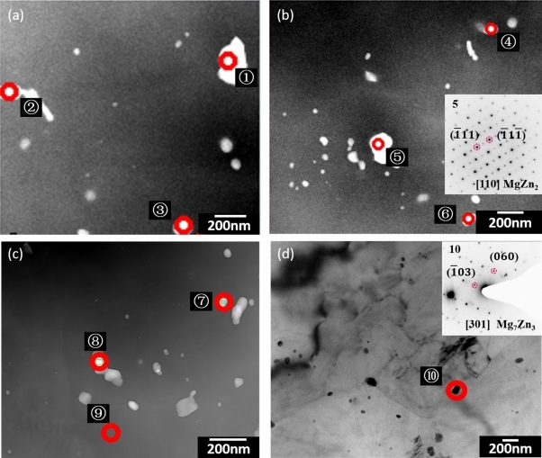 SADP)분석결과이다. 그림 4(a)-(d)는 4개의 서로 다른 위치에서 분석한 석출상을 나타내었으며 이미지에 표기한 9개의 석출상의 조성은 표 1에 나타내었다. TEM 이미지로부터 석출상의 크기가 100 nm 이하이고 EDS결과(표 1)와 SADP분석결과 (그림 4(b) & 그림 4(d))로부터 두가지 석출상을 확인할 수 있다. 하나는 MgZn2상이고 다른 하나는 Mg7Zn3상이다. 여기서 Mg7Zn3상은 고온에서 석출되는 상으로는 보고 되었지만 소성변형과정에 석출되었다는 실험결과는 보고된 바가 없다. SADP분석결과 Mg7Zn3상의 결정구조는 orthorhombic 결정 구조임을 알 수 있으며 이는 G. Shao et. al. [14]이 분석한 Mg7Zn3상의 결정구조와 일치한다. Mg7Zn3상은 준안정상으로 200 oC 이상에서는 α(Mg) + MgZn으로, 200 oC 이하에서는 α(Mg) + MgZn2상으로 분해된다고 보고되어 있다 [26]. 하지만 L.Y. Wei et. al. 연구팀의 연구에 의하면 Mg7Zn3상은 315 oC에서 완전히 분해되며 분해산물은 α(Mg) + MgZn2상이라고 하였다 [27]. K. Yan et. al.연구팀은 200 oC에서 장시간 시효처리 시 MgZn2상이 안정하다고 주장하였으며 [16] Y.P. Xie et. al. 연구팀의 연구에 의하면 MgZn2상과 Mg4Zn7상이 상대적으로 안정하며 안정성은 고용원소의 영향을 받는다고 하였다 [28]. Mg7Zn3상의 분해산물에 대한 연구는 추가적인 연구와 고찰이 필요한 것으로 보이지만 Mg7Zn3상이 MgZn2상이나 MgZn상보다 열 안정성이 약하며 다른 상으로 분해된다는 결과에 대해서 일치한 결론을 내리고 있다. 그러므로 단순한 열처리 공정에서는 Mg7Zn3상이 쉽게 형성되지 않음을 알 수 있다. 그림 5는 Mg-Zn 합금의 평형상태도를 PANDAT 프로그램으로 계산하여 나타낸 이미지이다. 그림 5에서 나타내었듯이 Mg7Zn3상이 정출 또는 석출할 수 있는 온도는 327 ~ 342 oC로 압출온도 (180 oC)보다 147 oC 높다. 압출 중 변형발열과 마찰발열로 인하여 실지 시편의 온도는 180 oC보다 높을 것으로 예상된다. 하지만 300 oC 이상으로 향상되지 않을 것으로 예상되는데 이는 압출시편의 온도가 300 oC 이상으로 향상되었을 시 평형상태도로부터 Mg-3 wt% Zn합금은 고용합금 즉 Mg에 대한 Zn의 고용가능 범위내에 있기에 석출이 아니라 오히려Zn가
