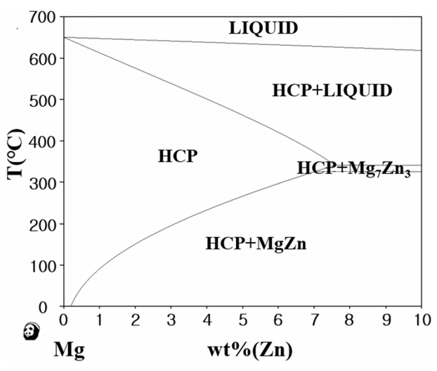 Zn는 0.27 wt% 과포화 고용되어 있다. 시편의 온도가 220 oC까지 향상되었을 시 Mg에 대한 Zn의 고용도는 향상되며 과포화 고용된 Zn의 양은 더 줄어든다. 그러므로 아주 적은 양의 Zn만이 석출에 참여하게