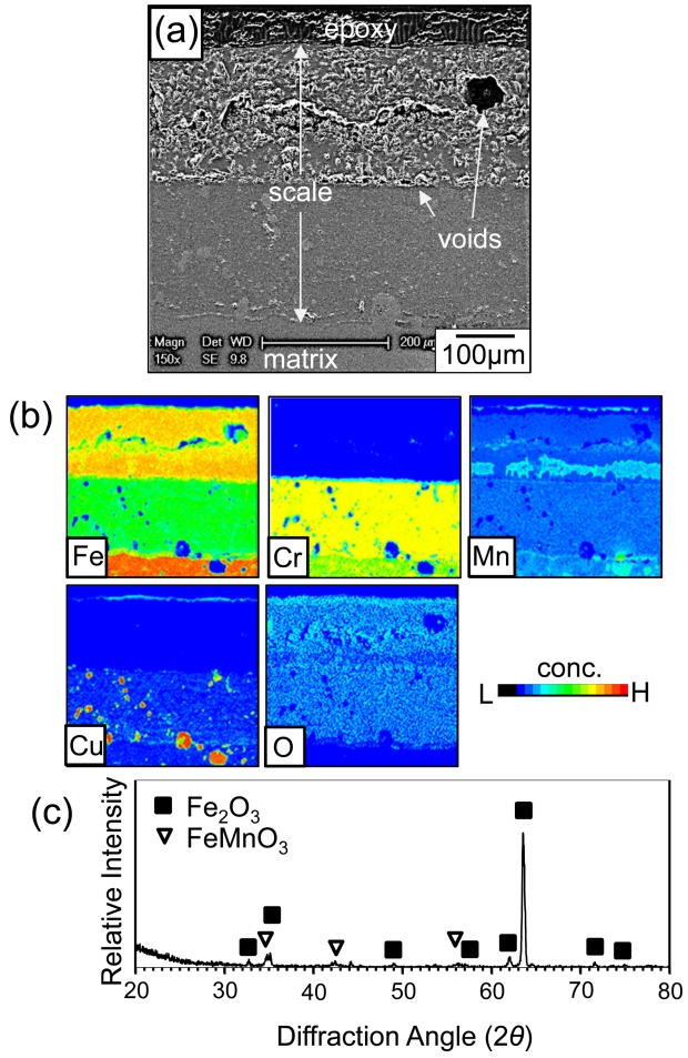inner, dense oxide layer was 240 μm-thick and Cr-rich (Figs 7(a-b)). Manganese diffused out faster than Cu from the secondary phase in the inner oxide