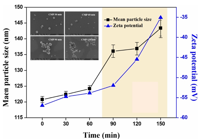 zeta potential and mean particle size with increasing process time were characterized