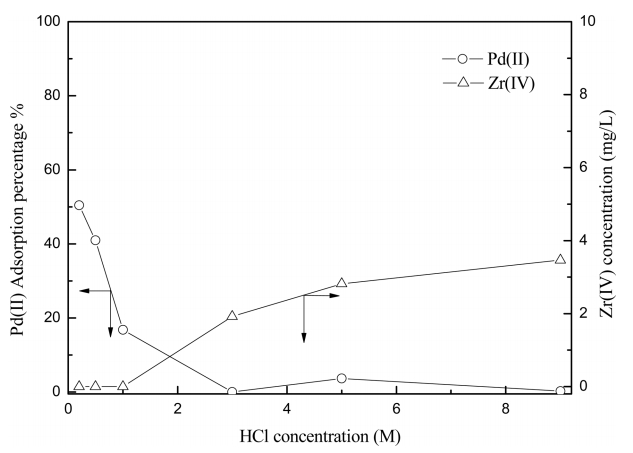 불안정해져 지르코늄(IV)이 용출되었다. 또한 염산농도가 일정한 조건에서 염소이온의 농도를 증가시키면 팔라듐(II) 흡착률이 감소하였다. 0.2-1.0
