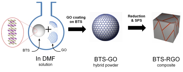 GO)을 환원시켜 시도하였다. 우선 BTS 분말을 제작한 후 이를 GO로 코팅하여 BTS-GO 복합분말을 제작하였다. 복합분말을 우선 수소 분위기에서