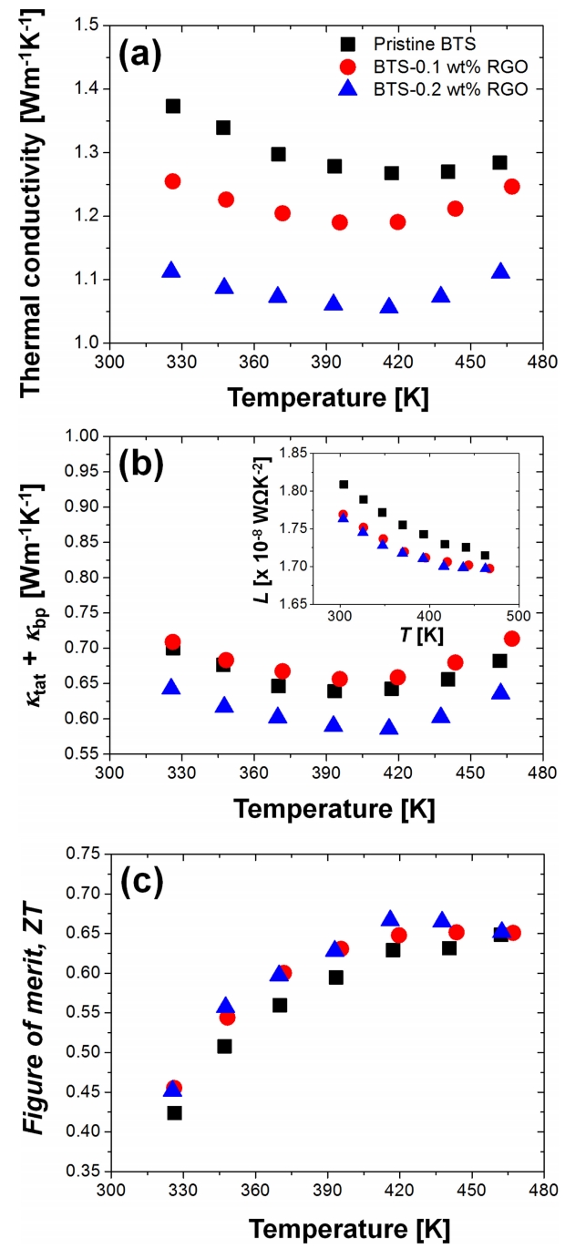 (a) Temperature-dependent total thermal conductivity, (b) κlat + κbp, and (c) ZT of the BTS-RGO composites. Calculated Lorenz nubmers are shown in the