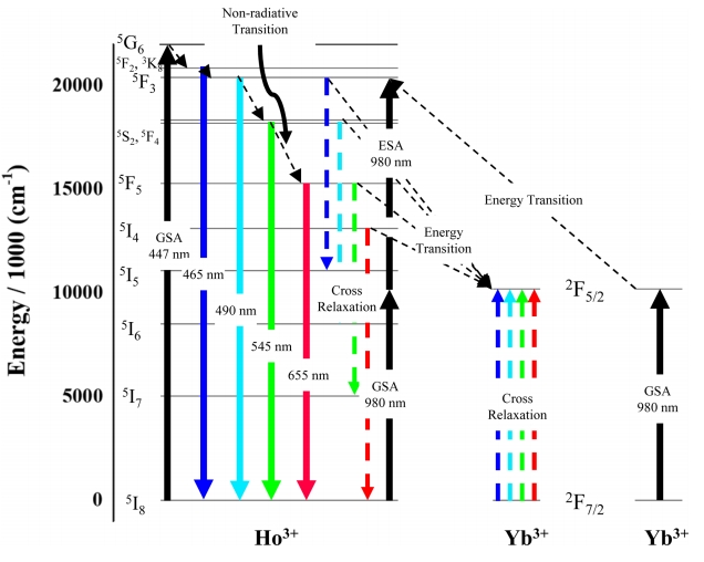 can be easily transferred to other ions [10]. This implies that the upconversion efficiency of Ho3+ can be significantly increased in the presence of co-doped Yb3+ [11].