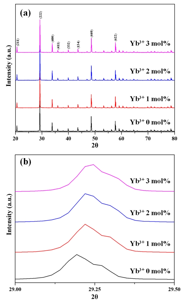 The XRD patterns of vacuum-sintered (1625 °C, 30 MPa, 15 min) Y2O3:Ho3+,Yb3+ specimens with different Yb3+ contents (Fig 2(a)) showed the presence of standard cubic Y2O3 (JCPDS Card No 41-1105) in all cases, with no other impurities were detected. La2O3 was found to be completely dissolved in Y2O3, and Ho3+ (1 mol%) and Yb3+ (0–3 mol%) matched perfectly with the space group