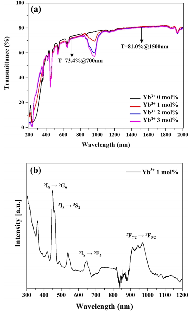 Figure 5(a) shows the transmission spectra of all samples, while Fig 5(b) shows the absorption spectrum of the 1 mol% Yb3+ specimen, revealing that this specimen exhibited transmissivities of 73.4 and 81.0%