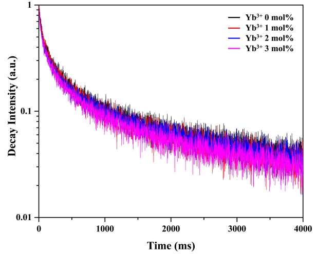 function, and decay times of ~140, 125, 110, and 100 μs were obtained for Yb3+ contents of 0, 1, 2, and 3 mol%, respectively. As a result, the decay time decreased