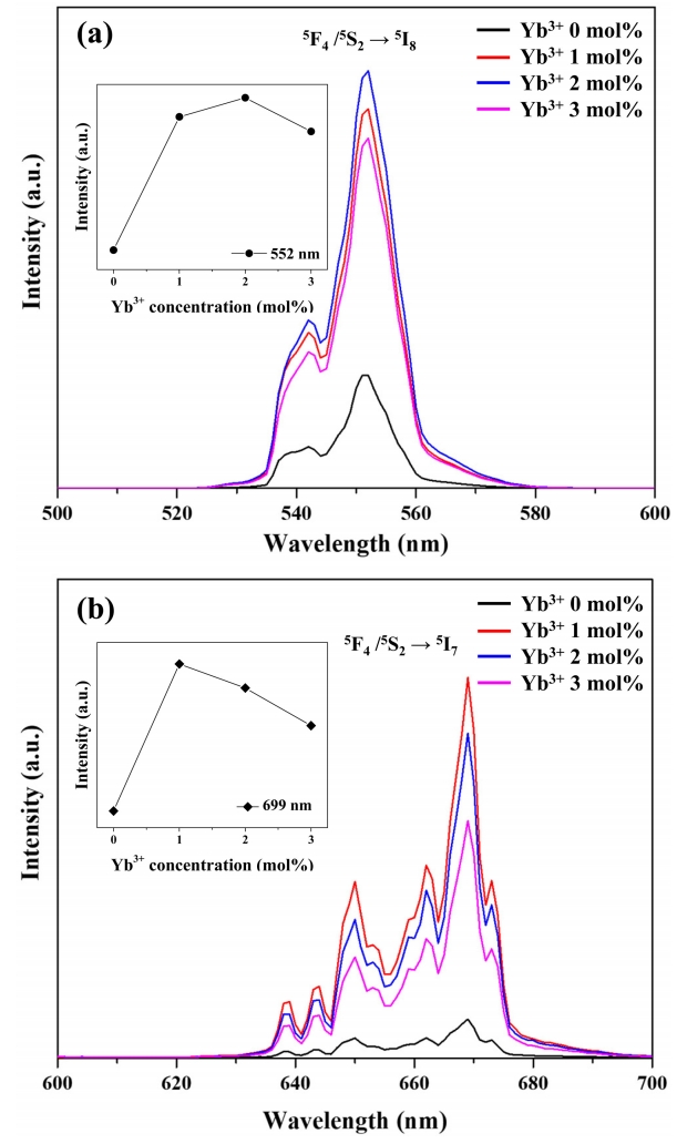 and induces transitions to the 5I5 and 5I6 levels (via ESA) as well as to the 5S2 and 5F4 levels (via GSA) of Ho3+ [36]. As shown in Fig 2(b), an XRD peak shift can be observed with increased Yb3+ doping concentration. The lattice distortion caused by the difference in the ionic