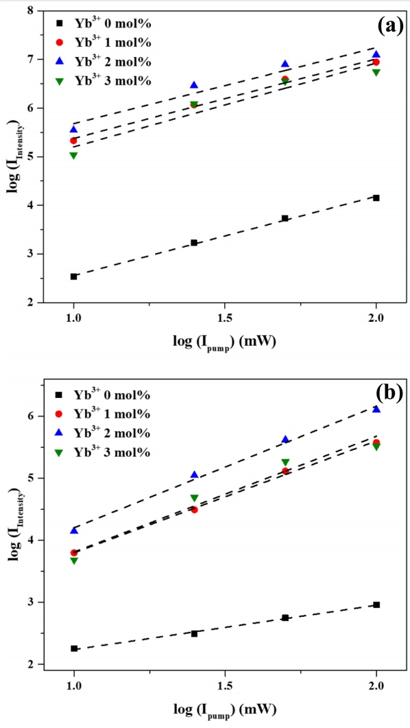 upconversion photoluminescence intensity was found to be proportional to the n-th power of pump power. Here, the dependence of photoluminescence intensity (IIntensity) on excitation intensity (Ipump) was modeled as IIntensity ∝ Ipumpn, where n is a constant [39]. The slopes (i.e., values of n) of each trend line in Fig 9 are summarized in Table 1.